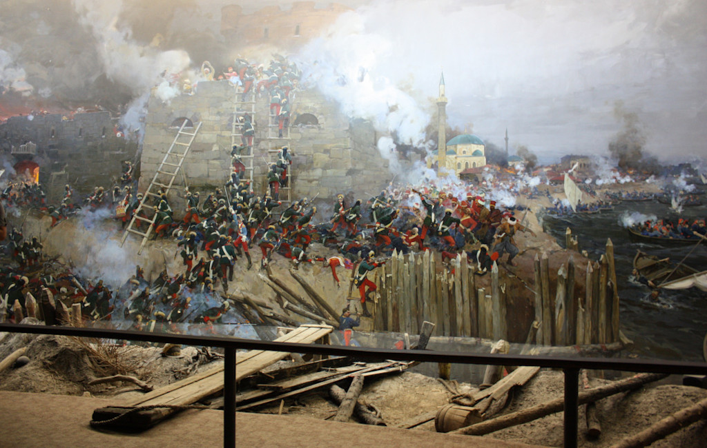 Сражение за крепость Измаил – одна из самых ярких страниц военной истории России. Османская крепость Измаил играла важную роль в русско-турецкой войне 1787–1791 годов и была взята в 1790 году войском А. В. Суворова. Помимо самого сражения, занявшего буквально несколько часов, весьма примечательна также и подготовка к нему, в ходе которой русские солдаты возводили временные укрепления и тренировались их штурмовать. Несмотря на поражение в войне, по условиям Ясского мира Османская империя сохранила Измаил за собой. Уже в ходе Русско-турецкой войны 1806–1812 годов, вновь победной для России, крепость в 1809 году была повторно захвачена. После неудачной для России Крымской войны 1853–1856 годов Измаил отошёл к Молдавскому княжеству, а все крепостные сооружения были взорваны. До наших дней сохранилась лишь бывшая малая мечеть XV–XVI веков постройки, в которой ныне размещается диорама «Штурм крепости Измаил», открытая 9 мая 1973 года (художники Е. И. Данилевский и В. М. Сибирский).