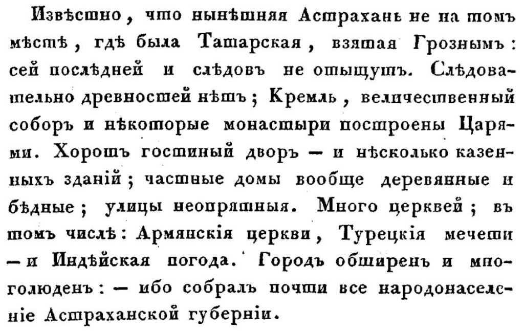 А вот Астрахань Сабурову категорически не понравилась. Ни общий облик, ни еда, ни архитектурные достопримечательности. К слову, Астрахань XXI века у автора этой статьи наоборот оставила только самые приятные впечатления и воспоминания (если не считать характерных для этой местности в целом пыли и жары). Что же вызвало у Сабурова такую неприязнь?