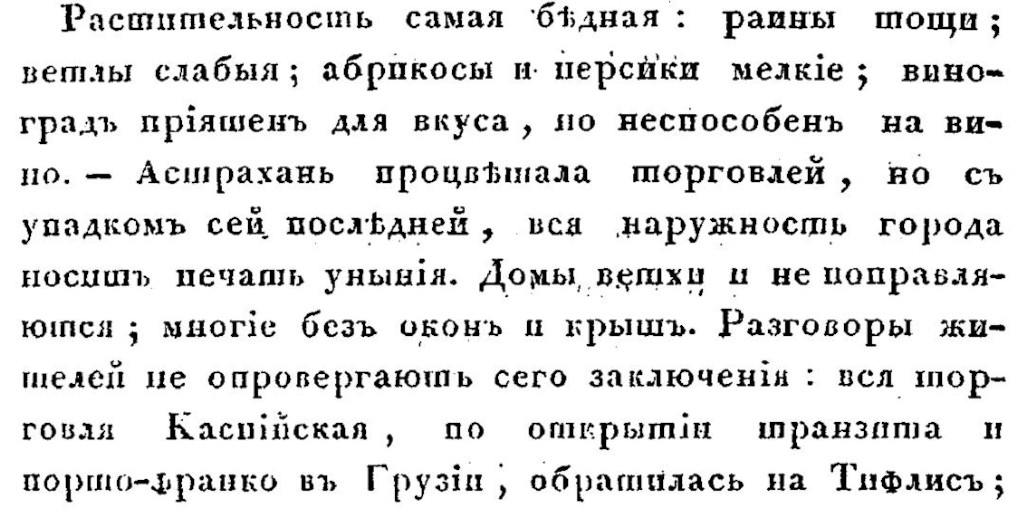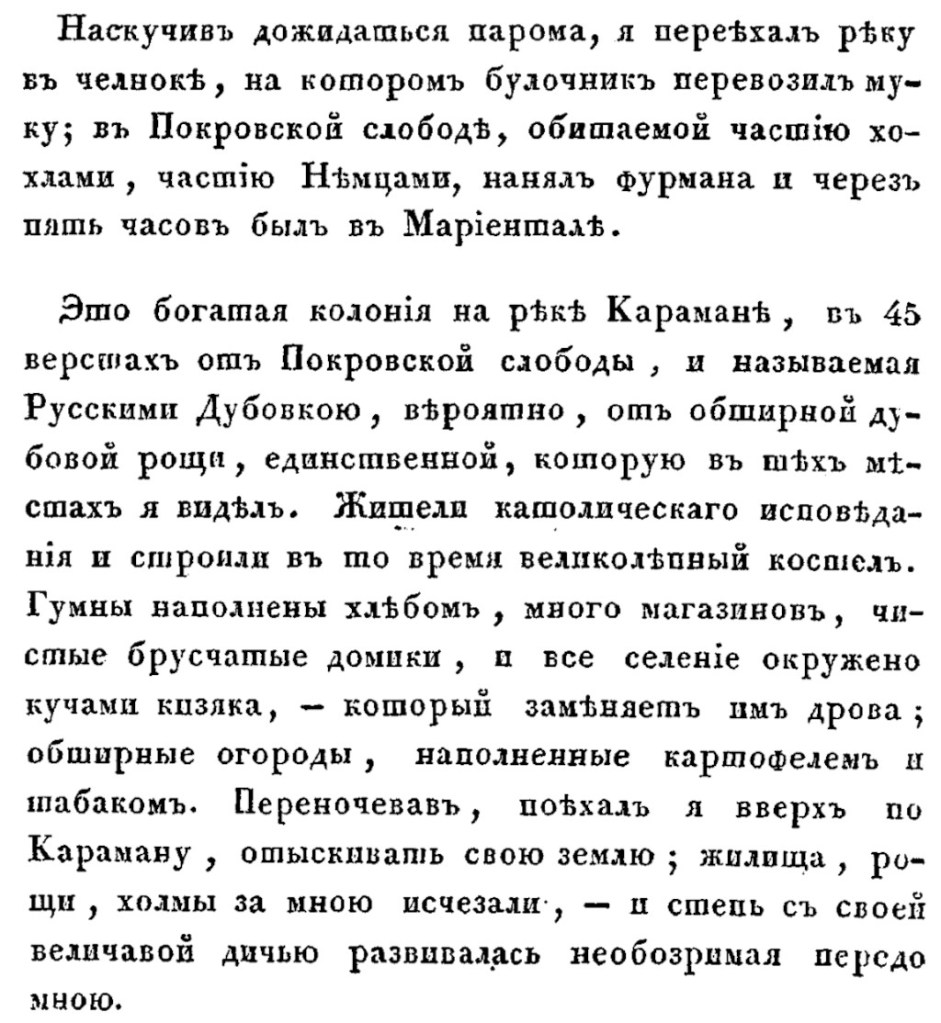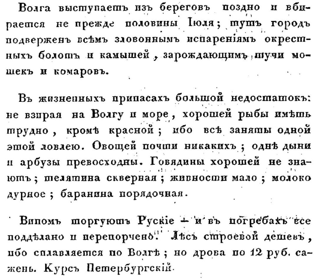 В качестве первого примера остановимся на книге «Поездка в Саратов, Астрахань и на Кавказ» Якова Ивановича Сабурова (1798-1858), тамбовского помещика и уездного предводителя дворянства. Довольно известный писатель-очеркист Сабуров в 1835 году опубликовал свой «тревел-блог» в журнале «Московский наблюдатель» и как отдельное издание. Что именно запомнилось Сабурову из увиденного?