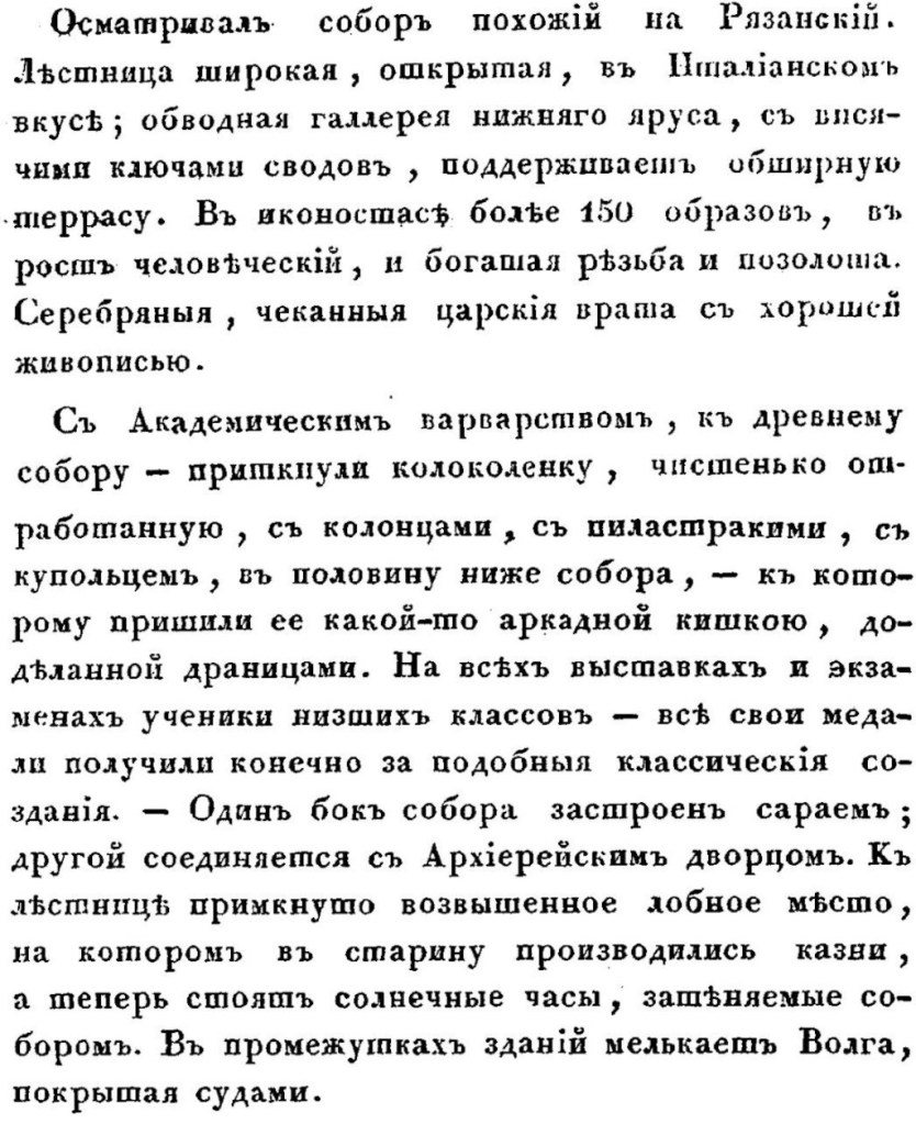 Автору однозначно довелось погулять по саратовской Никольской улице (ныне Радищева), и, если ещё точнее, по современной площади Чернышевского. Дом архиепископа был в итоге достроен в 1836 году и прекрасно сохранился до наших дней (в 1991 году возвращён РПЦ и вновь выполняет историческую функцию). А вот здание присутственных мест (ныне областной колледж искусств) в том виде, в котором оно восхитило Сабурова, уже посмотреть не удастся — в 1848 году его сильно повредил пожар, в результате чего были утрачены выходившие на площадь крыльцо парадной лестницы и колонный портик, а также ряд других элементов фасада.