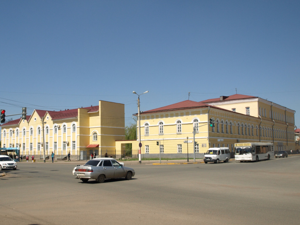Следующий на нашем пути шумный перекрёсток с улицей Пугачёва, на котором расположены музыкальный и географический корпуса университета имени Утемисова (последний занимает здание бывшей войсковой женской гимназии).