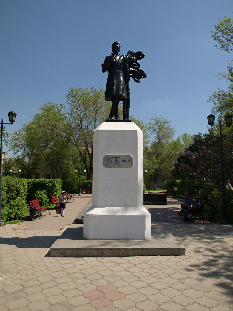 На противоположной стороне в уютном сквере находится памятник Александру Сергеевичу Пушкину, который, как мы уже знаем, имел честь бывать в Уральске. Именно в ознаменование этого исторического события, имевшего место 160 лет назад (на тот момент), в 1993 году был установлен бронзовый памятник великому русскому поэту, выполненный в Москве скульптором Р. К. Мурадяном.