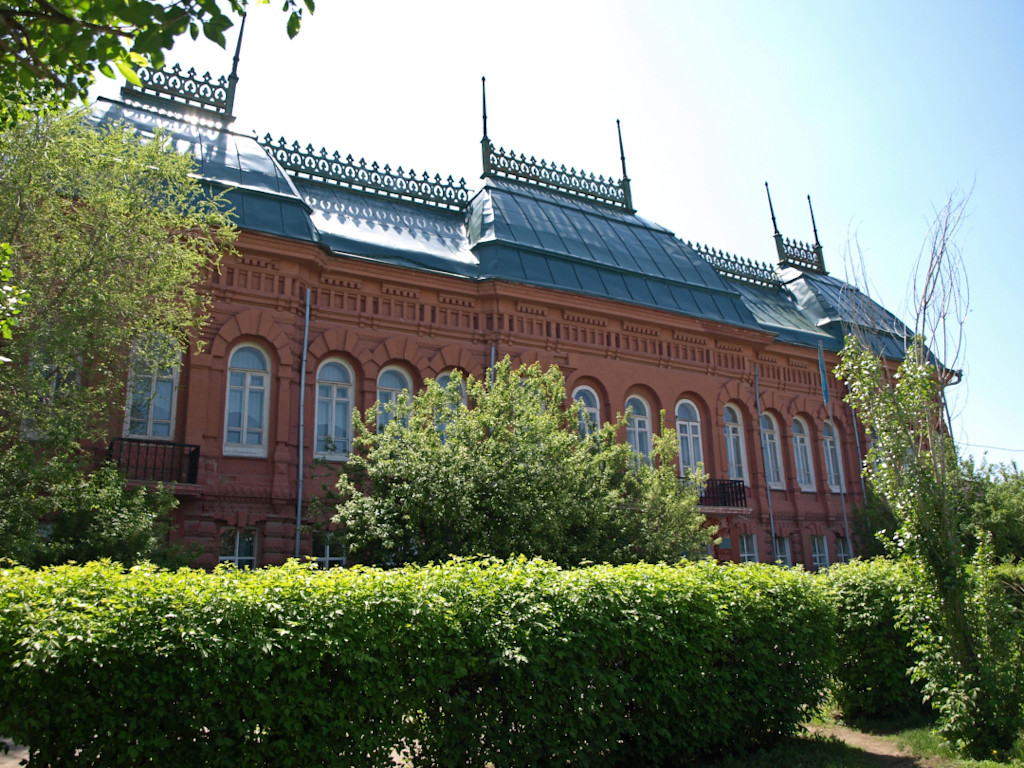 Напротив университета расположен дом купцов Ванюшиных, возведённый на рубеже 1870-х и 1880-х годов. Это здание смело можно занести в список наиболее ярких дореволюционных построек Уральска. Изначально в нём размещался Коммерческий клуб, который в советские годы сменили сначала государственные, а затем образовательные учреждения. Сегодня в здании работает лицей.