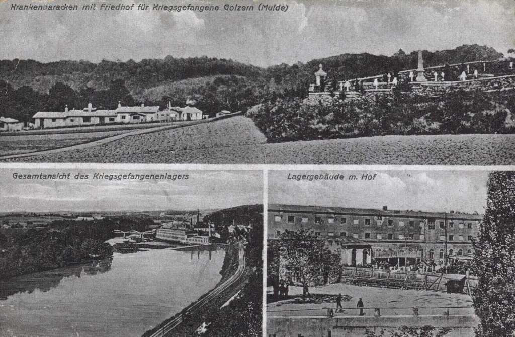 С началом Первой мировой войны в августе 1914 года хозяин бумажной фабрики местечка Гольцерн под Гриммой предоставил пустовавшие помещения машиностроительного цеха под размещение в них лагеря военнопленных. Уже в первые недели сюда прибыли две тысячи пленных, 8 октября — 838 французов, 19 февраля 1915 года — 1200 русских из лагеря Ламсдорф в Силезии (в том числе 218 гражданских, попавшихся на шпионаже и саботаже). Просуществовал лагерь Гольцерн до конца марта 1917 года, после чего пленных перевели в лагерь Эберсдорф под Хемнитц.