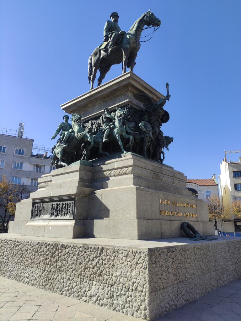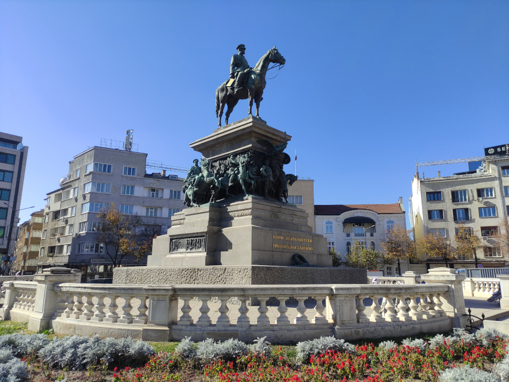 В квартале к югу от церкви Александра Невского на площали Народного собрания стоит конный памятник царю-освободителю Александру II. С инициативой установить его выступили после войны болгарские ополченцы, денежные средства собрали городские власти и добровольные жертвователи. Автором монумента, возведённого в 1901-1903 годах, является флорентинский скульптор Арнольдо Дзокки. Торжественное открытие и освящение состоялось 30 августа 1907 года в присутствии болгарского князя Фердинанда І, великого князя Владимира Александровича с супругой Марией Павловной и сыном Андреем Владимировичем, командира ополченцев генерала Столетова и других почётных гостей. Бронзовый император возвышается на массивном гранитном постаменте, в основании которого лежит подаренный румынскими союзниками венок. Обе стороны постамента украшены малыми скульптурными группами, в которых изображены генералы И. В. Гурко, М. Д. Скобелев, главнокомандующий Великий князь Николай Николаевич, русские солдаты и болгарское ополчение.