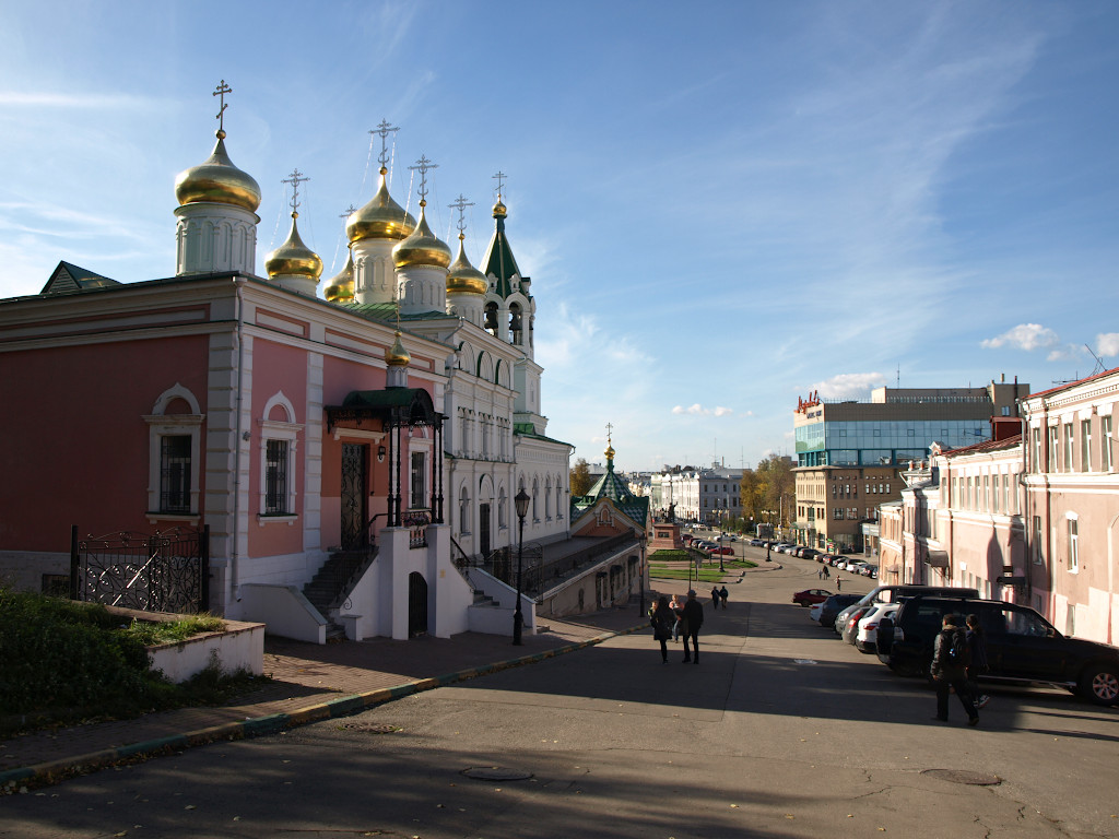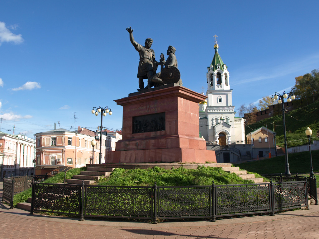 Минин и Пожарский на фоне собора Василия Блаженного в Москве — один из самых узнаваемых ракурсов России (если не самый). Созданное выдающимся мастером Иваном Петровичем Мартосом в 1810-х годах изваяние получилось настолько удачным, что с учётом художественной ценности и общей значимости установили его не в Нижнем Новгороде, как задумывалось изначально, а в первопрестольной столице. Когда в 2004 году возникла идея создать легендарным старосте и полководцу скульптурный памятник на «родине» народного ополчения (и, в какой-то мере, восстановить историческую справедливость), решено было поставить на площади Народного Единства реплику московского монумента перед храмом Рождества Иоанна Предтечи на Торгу. Место это было выбрано неслучайно: по легенде, именно здесь у деревянного храма-предшественника под кремлёвскими стенами начало собираться нижегородское ополчение.