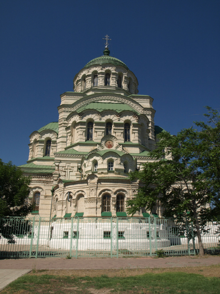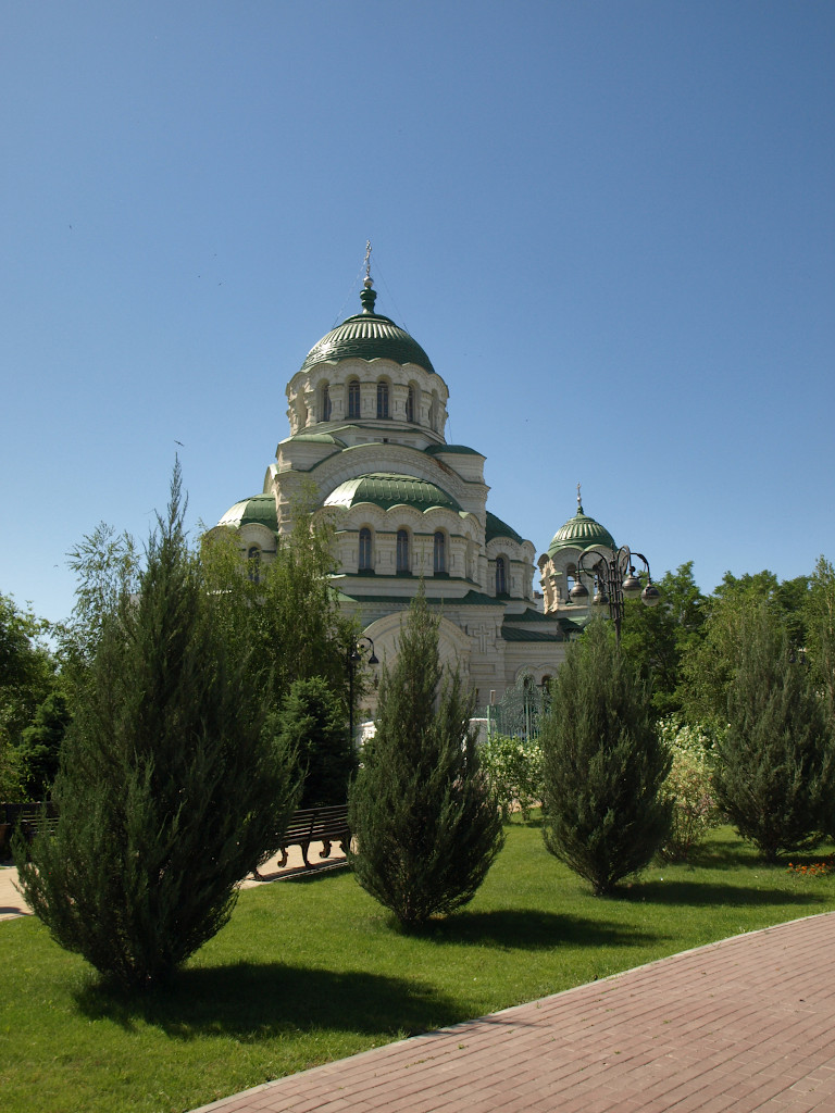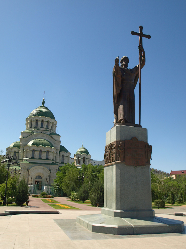 Астраханский собор во имя Святого Князя Владимира был заложен в 1895 году на пустопорожнем месте возле условной границы русской и татарской слобод. Решение о строительстве было принято Городской Думой в 1888 году в ознаменование 900-летия крещения Руси, через два года был утверждён выполненный в неовизантийском стиле проект петербургских зодчих В. А. Косякова и Н. Э. Икавитца. В последовавшие несколько лет шёл процесс сбора средств, осложнившийся неурожаем и эпидемией холеры. Строительство заняло семь лет, руководил им городской архитектор П. И. Коржинский. 15 июля 1902 года состоялось великое освящение храма, приуроченное к 300-летию Астраханской епархии. 29 сентября 1903 года епископ Астраханский Георгий в сослужении специально приглашённого Иоанна Кронштадтского освятил правый придел в честь Святителя Николая Чудотворца. Левый придел Святителя Алексия, Митрополита Московского, был освящён архиерейским чином 28 ноября 1904 года.